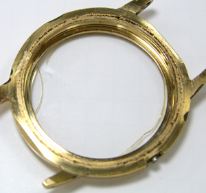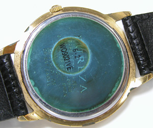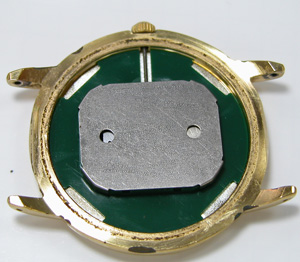 裏蓋は”はめ込みタイプ”。もうシールが黄ばんでおりますから剥がさないといけませんね・・・裏蓋を開けると耐磁プレートが見えます。