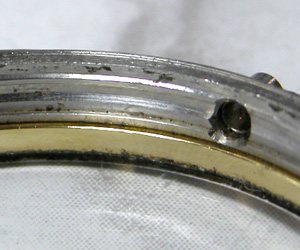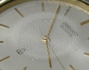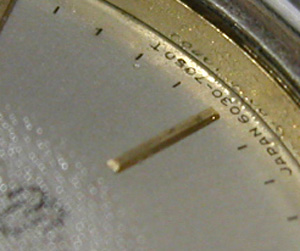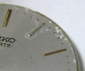 竜頭パイプ裏側もチェックします。インデックスにもサビが。ムーブメントを取り出して1日乾燥させて電池交換、まず無理と思いましたが・・・動きました!