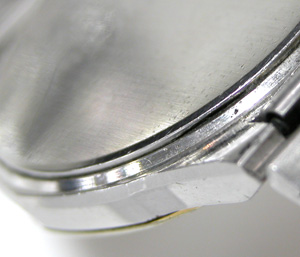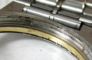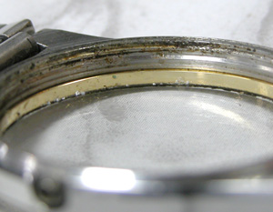 ケース内側も錆びておりますね・・ガラスの境目が黒いのは表側のガラスとベゼルの隙間の汚れです。