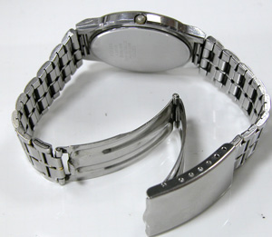 ベルトは板巻きバンドの板バネ三つ折れバックル。裏蓋は”はめ込みタイプ”