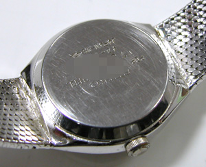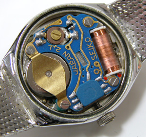 裏蓋は”はめ込みタイプ”ベルトはケースと一体型です。これがキャリバー。かなり古いクォーツです。