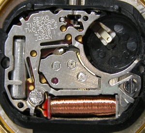 これがムーブメント。ムーブメント拡大。SEIKO TIME CORPですが何処かで見たムーブメントですね。