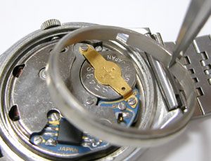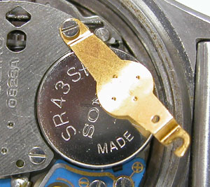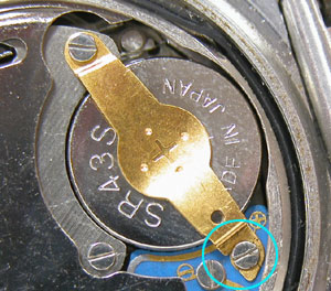 懐かしいムーブメント。SR43SW”通称301電池”これで2年持ちます。こうやって電池をネジ2本で留めている辺りが凝った作りです。今の時代のムーブメントはクレドールであれ、電池を金属板で固定するなんて事はしませんからね。