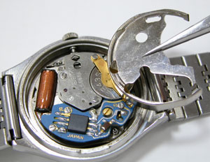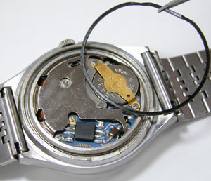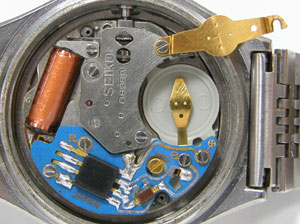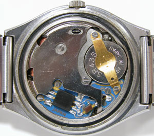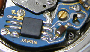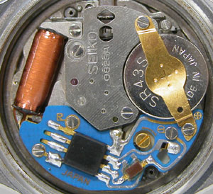 こうやれば感単に交換出来ます。こういったハンダむき出しの基盤が懐かしいレトロな雰囲気。この頃のムーブメントは丈夫です。この頃からセイコーは、クォーツムーブメントの薄型化へのチャレンジが始まる訳です。