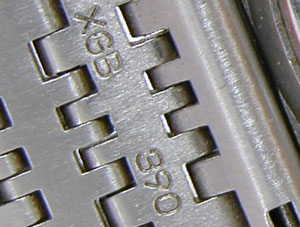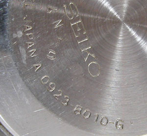 裏蓋は”はめ込みタイプ”。まだクォーツの薄型化が始まる前ですから、とてもスクリューバックにまで手が回りません。ベルトにはパーツナンバー。