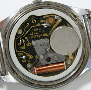 ケース周辺がかなり錆びておりますのとムーブメントは湿気でくすんでおります。この電池押さえが危うい感じもしますが電池交換で問題なく動きました。この状態で動くのですからセイコーのこの頃のムーブメントは丈夫ですね。