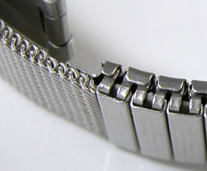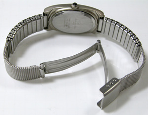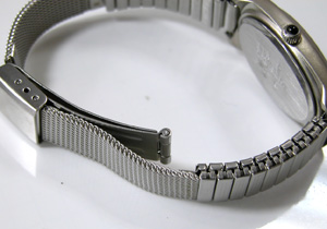 三つ折れバンドですが。エバー伸縮とメッシュバンドのコンビは始めて見ましたね・・・こういった大胆な組み合わせは雑貨ウォッチならでは。