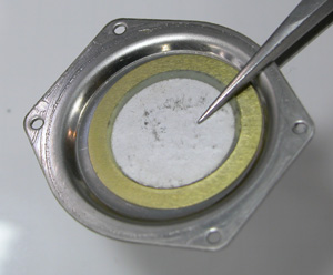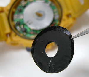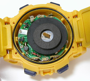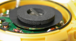 何とスポンジのスペーサー。アラームの共鳴板が見えますが裏蓋が薄い素材であることも分かります。