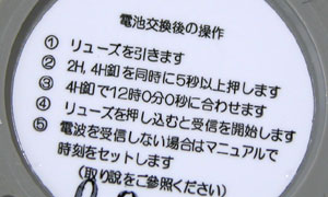 交換後は裏部の”裏面記載”に従おります。マルマンの電波もそうでしたが”12時合わせ”でこの様に秒針が高速で回転して受信状態になります。あとは放置して受信の完了を待つのみ。