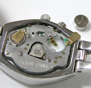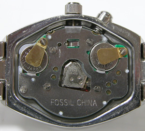 これがムーブメント。「FOSSIL CHINA」FOSSIL ってブランドウォッチの中に入れる人も居ますが、こういうムーブメントを見ては、わたしなどは雑貨ウォッチではないか?と思ってしまうのですね・・・ 電池格納部をチェックします。