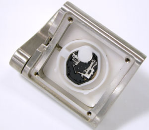 裏蓋はネジ留め。 ここに竜頭が見えますので中は腕時計のムーブ。
