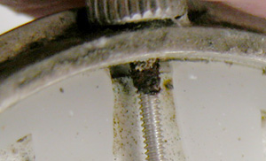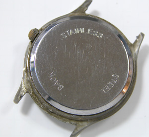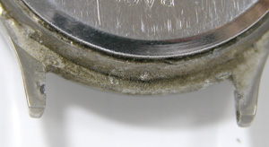 文字盤の金属表面にサビが浮いて文字盤の塗装を押し上げております。つまり表側(ガラス側)ではなく文字盤の裏側から湿気が入っております。裏蓋は”はめ込みタイプ”ですが、まったく手入れされておりません。