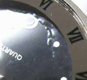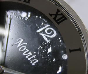 文字盤には”novita”と書いてあります。角度を変えて見れば文字盤が浮いているのが分かります。湿気で塗装が浮いてますね。