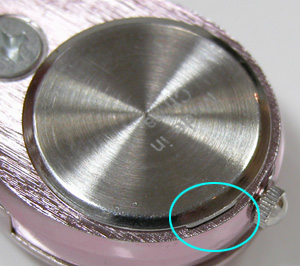 テントウ虫型時計の電池交換です。雑貨ウォッチの電池交換を受けている所では見慣れた時計であると思われます。これシルバーやゴールド・コンビ色々ありますが、このピンクは珍しい。