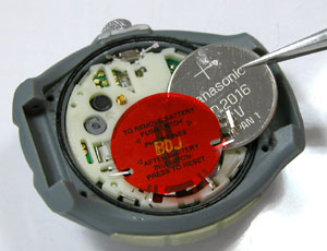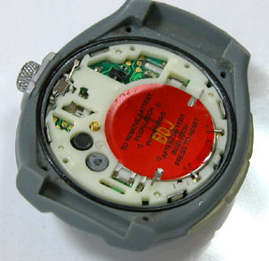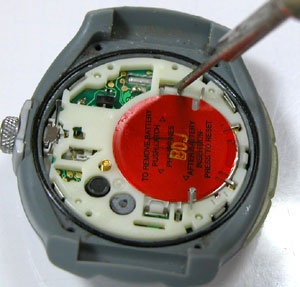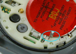 電池の上の赤いフィルムに何やら書いてあります。電池交換が完了すれば「リセット」なのですが「AC」端子がありません。「AFTER BATTRY INSTRATION PRESS TO RESET」と書いてありますが・・・何をプレスだ??結局は蓋を戻せば○位置のレバーが押さえられてリセットですね。