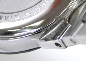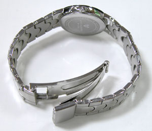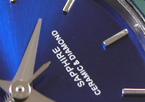 文字盤の記載は「サファイアガラス」「セラミックベゼル」「ダイヤモンド」といった意味です。ベルトもステンレス無垢です。この仕様で時計メーカーなら定価10万といった所か。