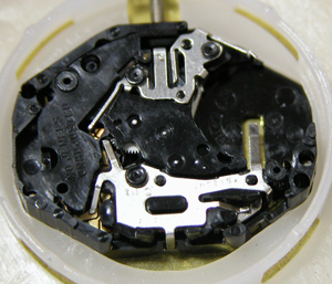 これがムーブメント。ネジすら無いムーブメントで歯車はプラスチック。修理は出来ませんね。
