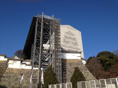今日は歩くコースをお城にしてみました。まだ素屋根で覆われております。写真はお城の東側進入路からの撮影、つまりお城を横から眺めるので厚みが無い。