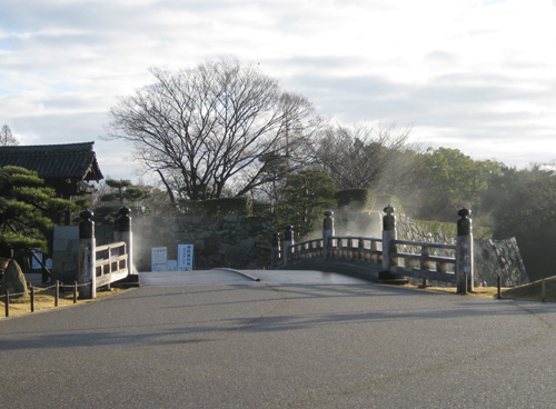 今朝も散歩しておりましたらお城の正門に掛かる木製の”橋”。ゆうべのうちに染み込んだ露が朝日に照らされ水蒸気に変わるところで橋全体から煙が立ち上るかの様な絵になっておりました。