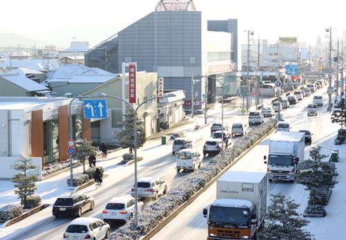 渋滞中。姫路の街が銀世界になるのは毎年の事ではありません。