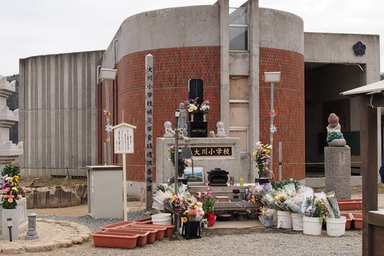 校舎の前には慰霊碑があり、ここでもお参りの読経が響きました。