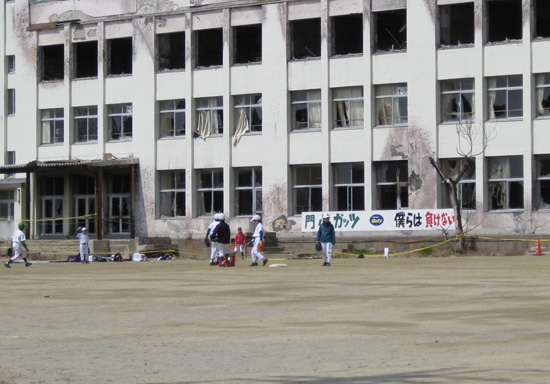「僕らは 負けない」と書かれた横断幕の前で子どもたちが野球をしている。