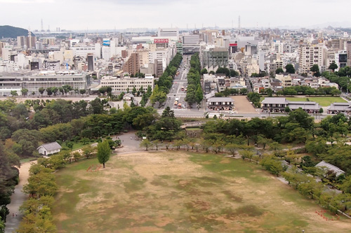 天守から見る姫路駅。(手前がお城の、三の丸広場)