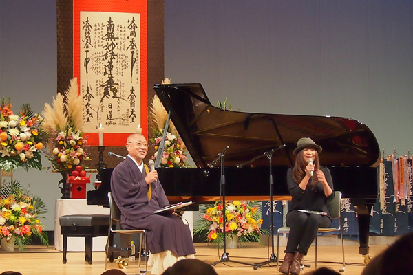 (お題目の掛け軸を背景にスポットライトを浴びて歌う姿は神々しくみえます)