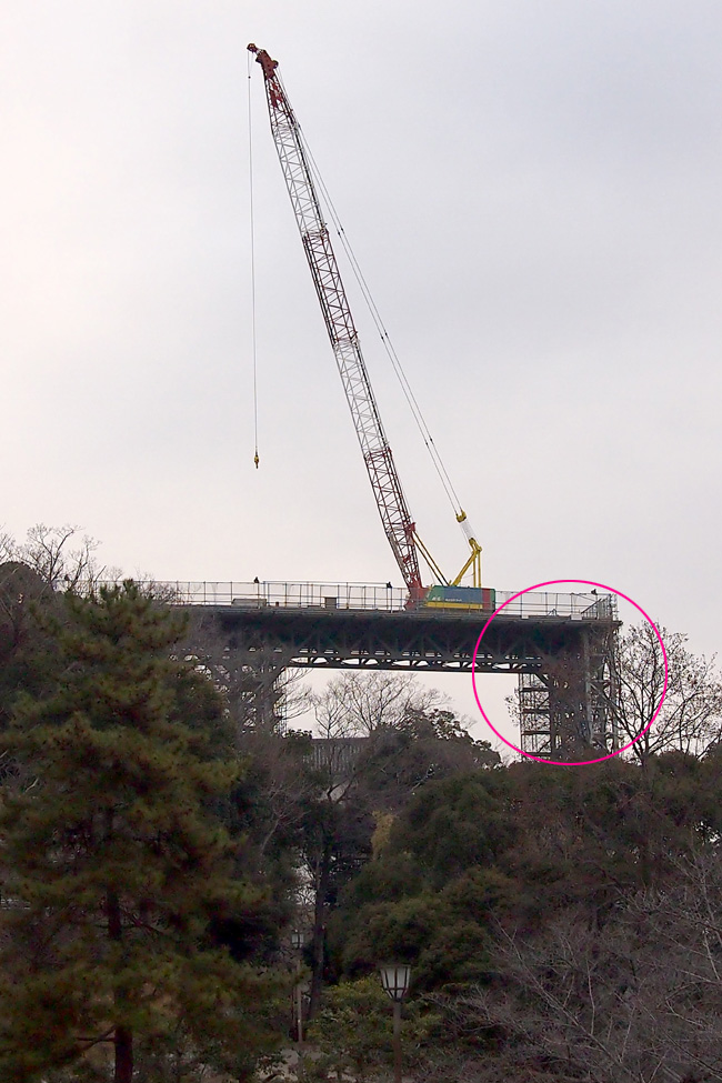 東側から見て左に見える鉄骨(クレーンの基礎部分)が作業者用エレベーター