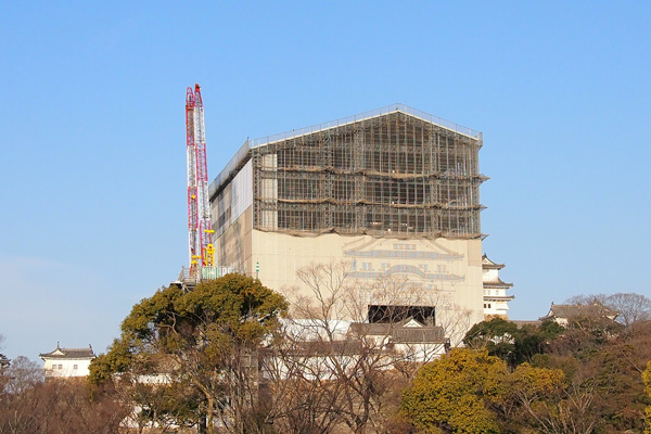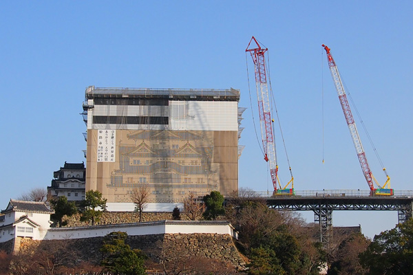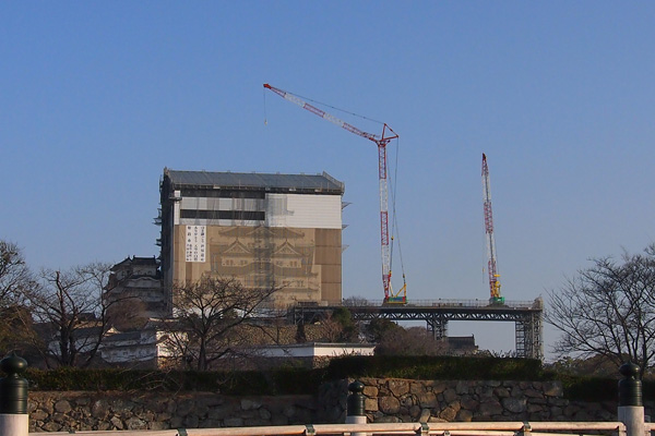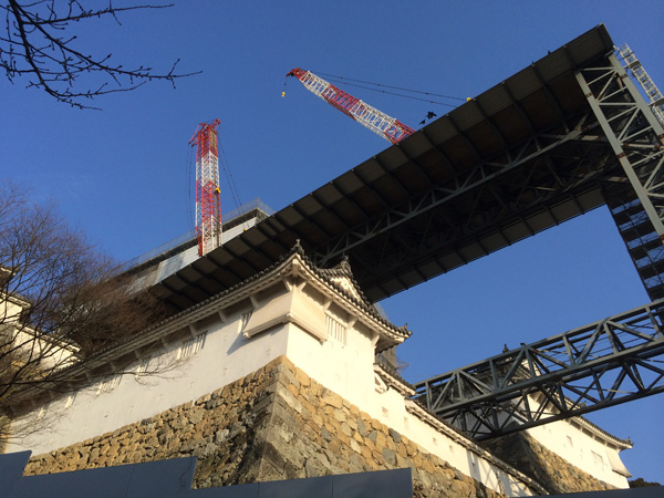 歩いてお城の正面に回るとクレーンがお城に近づいて行きます。写真では分からないですが重機の後ろから煙が出ており、まるでアニメで車が煙を噴きながら走っているよう。遠くから見るとデカい図体で小さな煙を吐いている姿は可愛い絵になっております。