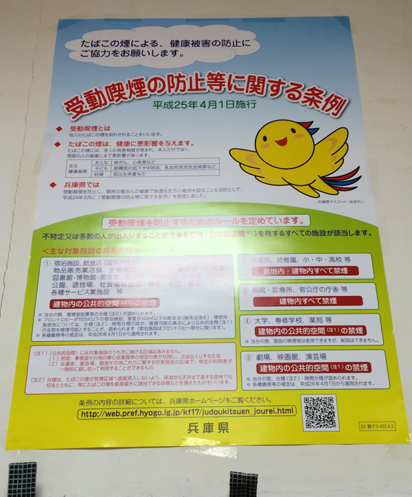 何でも4月から「兵庫県の条例」で飲食店等、人が集まる公共の場では全面禁煙になったとか。