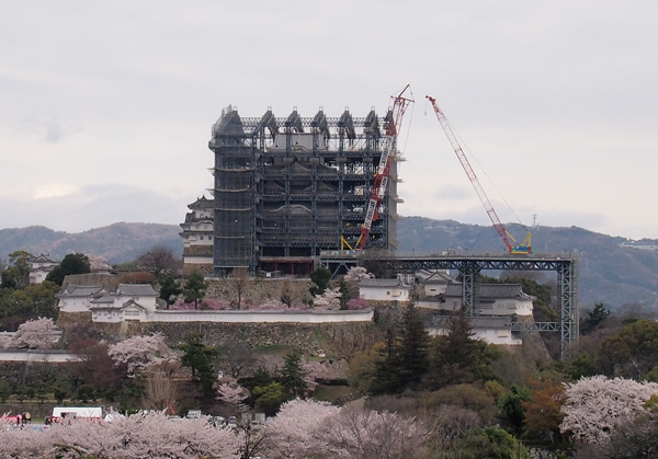 イーグレ姫路の屋上は5階の高さ。そこから見てもクレーンは高い位置にある事が分かる写真ですか。お城の素屋根も幌が取れて骨組みだけになっております。