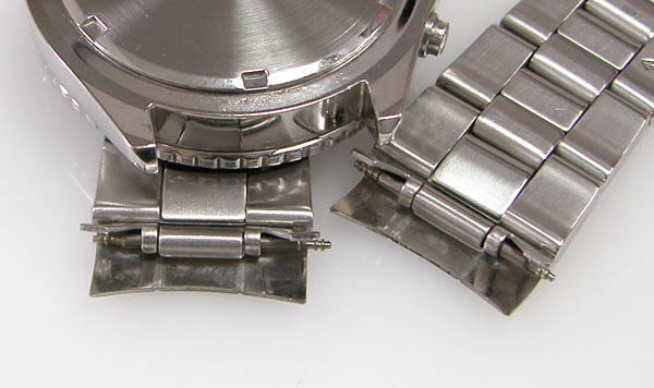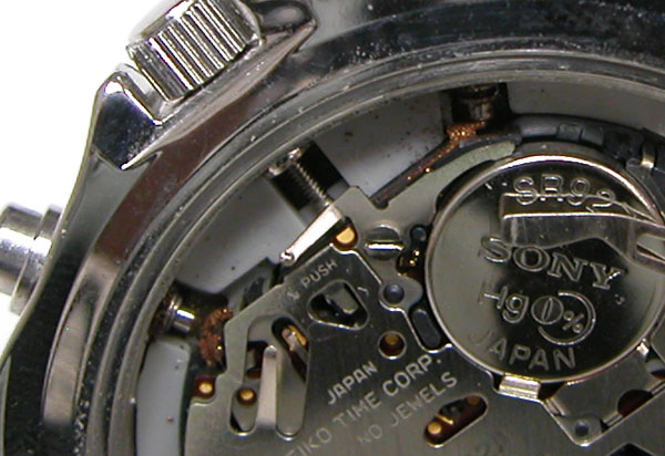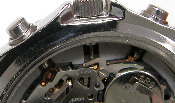 押し込まれたプッシュボタンと連携した、ムーブメント側のレバーのサビ。