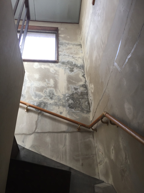 屋上のエントランス内部ですが雨漏りで壁はボロボロ。 築45年ですから自然な成り行きでもあります。