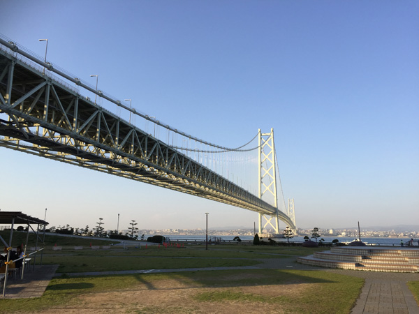明石海峡大橋を下から望みます。海岸の向こうは神戸の町並み。