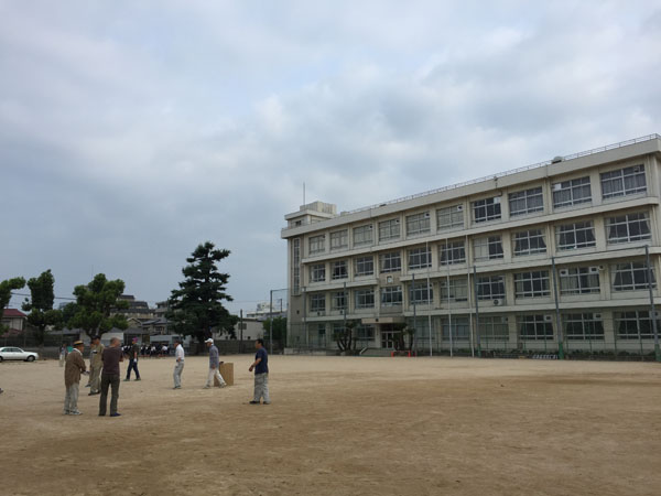 午前中、何も無い普段の校庭ですが作業開始。天気は「曇天の空模様」で好都合。