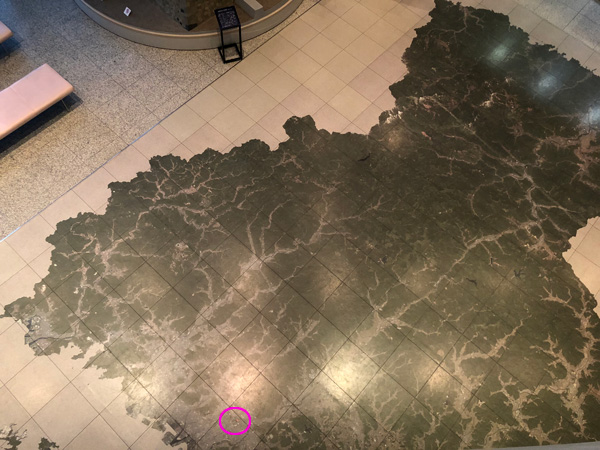2F渡り廊下から1Fロビーを見下ろすと床いっぱいに