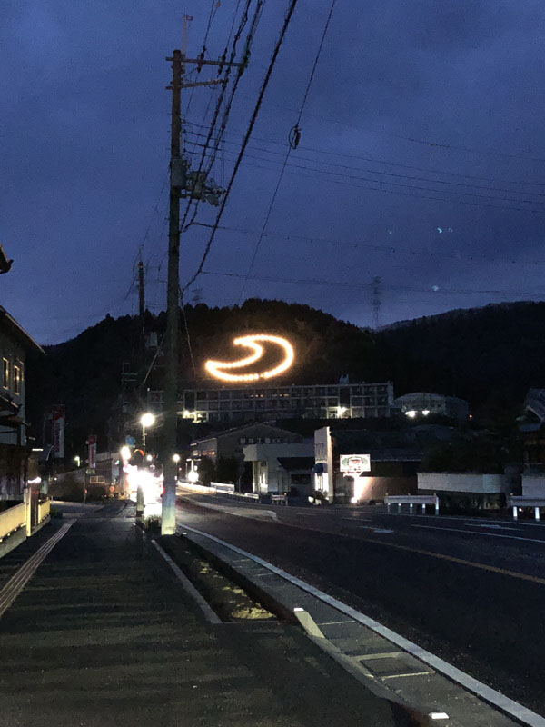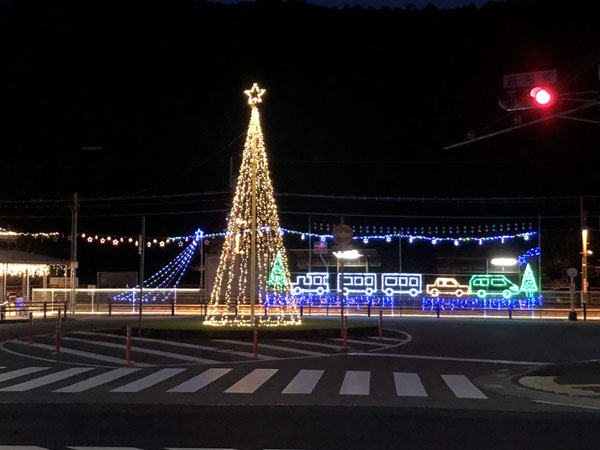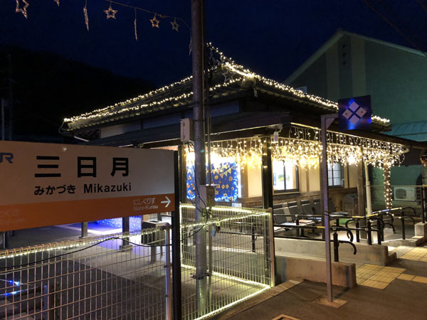 三日月 駅の前をとおるとイルミネーション。夜はこんな演出になっていたとは。