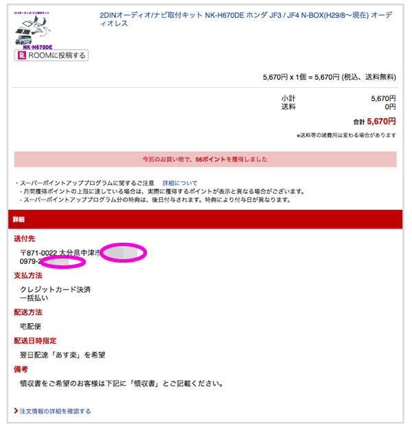ここには本来「購入者の名前と住所がありますが。送り先の住所・電話番号に