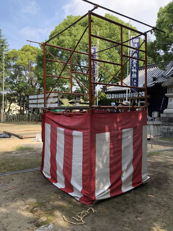 先ずはお寺も同じで「幕張・提灯・のぼり」ですが次に「輪抜けの枠組み」作業が加わります。