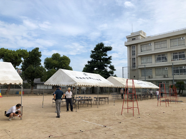 早朝の小学校のですが、先ずはテント張りから。