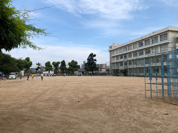 台風の影響で風が強く、人が集まるまで乾かない程度に水まきですが、直ぐに乾いてくるので1時間くらいずっと撒いておりました。人が集まりだしたので引き上げて。校舎の上から撮影。