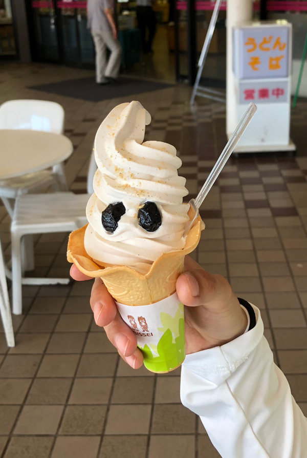 昼の3時ころでしたか「夜久野そば」で有名な夜久野ドライブインで「丹波の黒豆ソフト」これまた美味しく。食べてばかりなので運動をしようと。