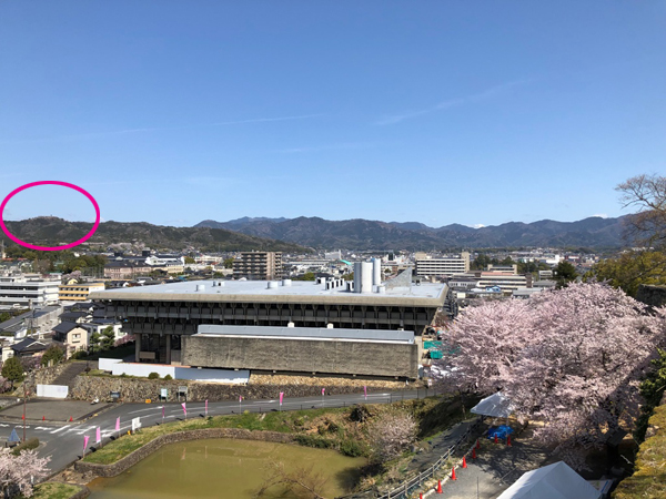 お城から周囲360度のパノラマが開けますので、眺望していると北東の方角に何やら小高い丘というか、山というか?早速、Googleマップで確認すると「城跡」があるようで。