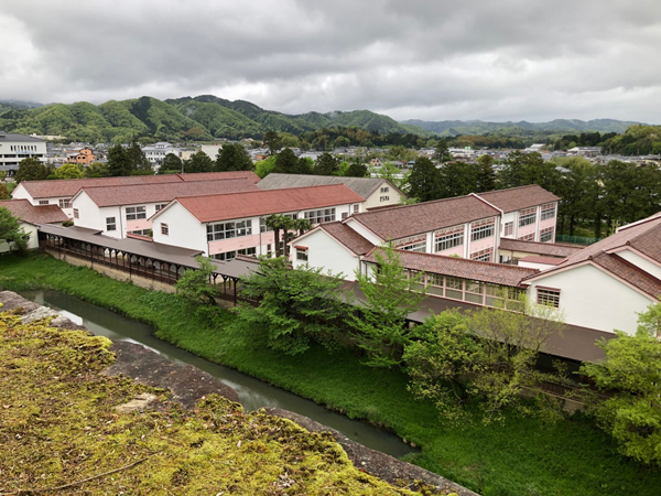 城跡から見える小学校。過疎化が進み校舎の半分以上が使われていないとか。