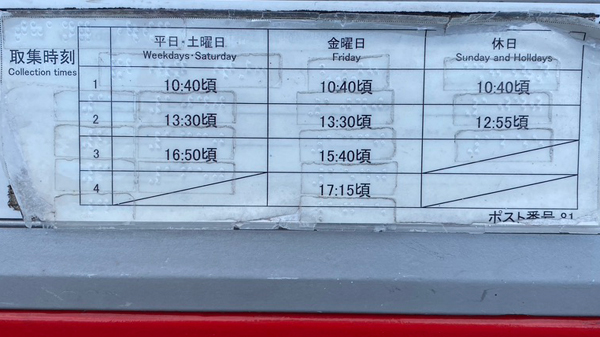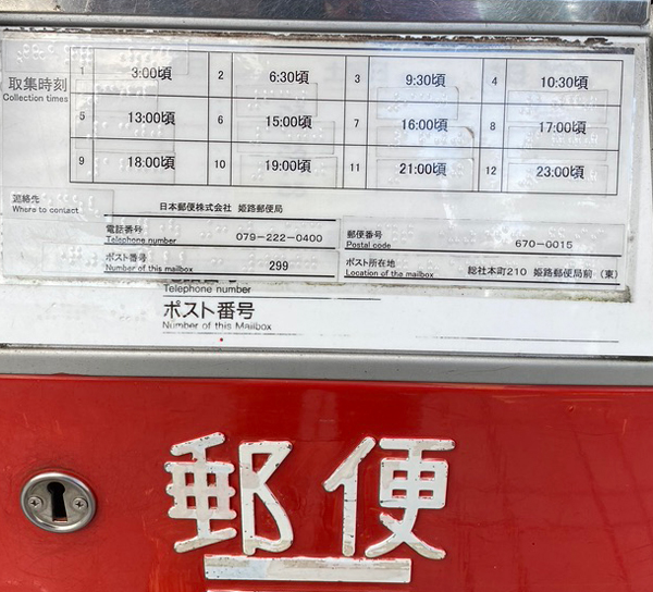 本日「日曜は12:55が最終」。1時間くらいの遅れなら本局へ持ち込めば本日の発送に間に合うか?と、運動がてら歩いて15分くらいの姫路郵便局の本局まで行ってきました。窓口で手渡す積もりが本局の目の前のポストを見ると。