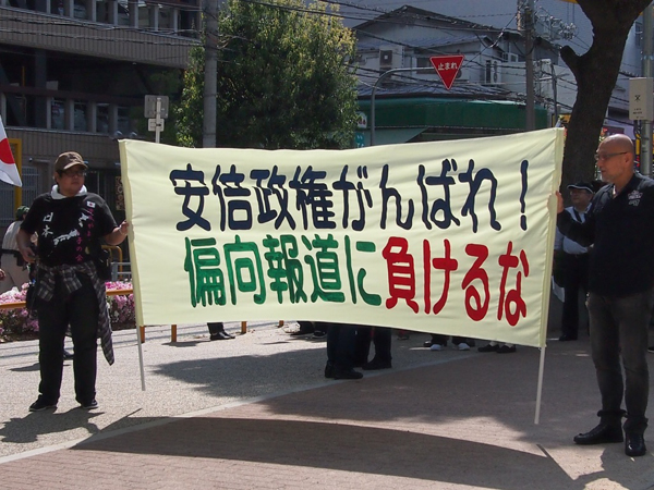 「偏向報道は許さない!」という文字の横断幕が。