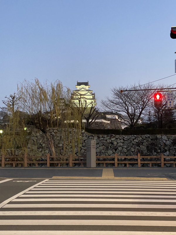 姫路城もまだライトアップの時間。お城の前を通過して。