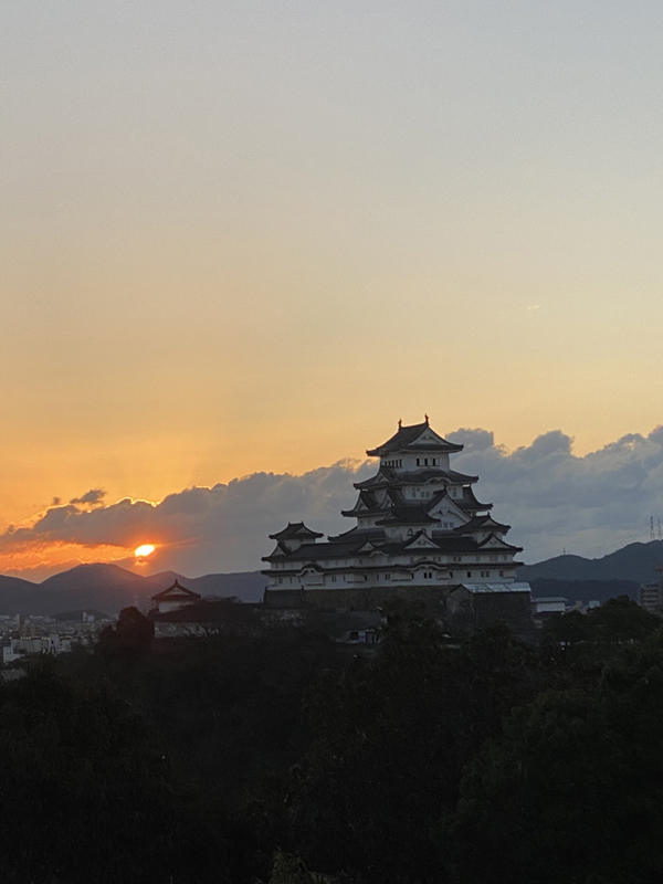 帰りは、姫山公園を抜けて振り返ると「初日の出に照らされるお城」と「お月様」のコラボ。