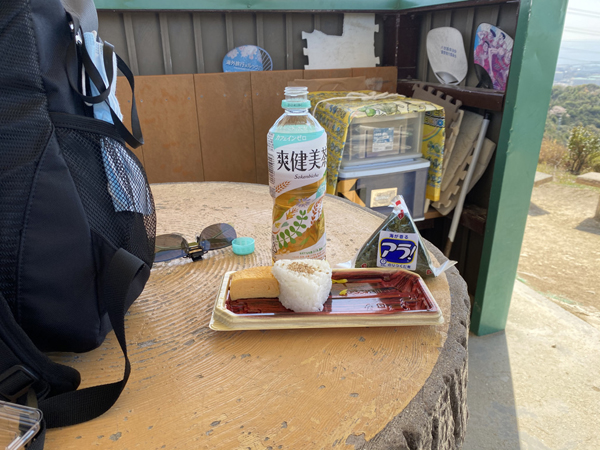 お昼をここで頂くのが目的ですから山頂の東屋でランチタイム。イオンのおにぎり「アラ!」美味しくてはまっております。